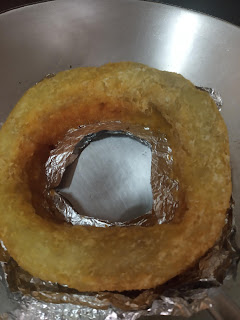 A good yam basket should be crispy and fluffy at the same time. The ring is made out of steamed yam and is deep fried. I prefer to make yam basket with a slightly thinner wall but not too thin that they lose their stability when form a ring. A thinner basket also ensures the yam is properly cooked through. To make the frying easier, I made a mould out of aluminum foil. Dropping the whole ring into the oil will cause the bottom to get burnt easily when it comes into direct contact with wok.