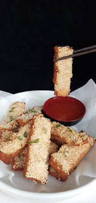Prawn toast is big in flavour and it's fairly simple to put together. The topping is a mixture of prawn, light soy sauce, sugar and white pepper. Then you roll the top with seseme seeds and deep fried to crisp perfection.